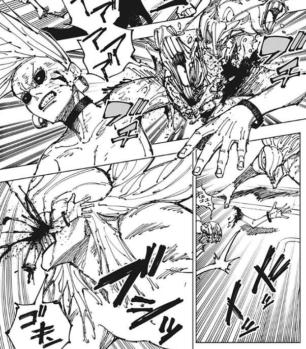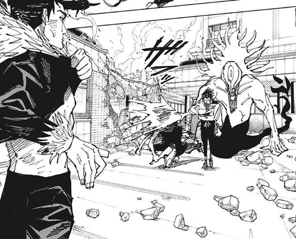 グラニテブラストを食らい烏鷺は壁に体を叩きつけられ、意識を失ってしまいます。また、黒沐死もグラニテブラストを食らい、半身にダメージを負ってしまいます。そこに乙骨が近づいてきて、黒沐死の頭を掴み反転術式の生のエネルギーを食らわせます。