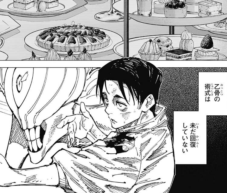 黒沐死も倒れ、乙骨と石流の一騎打ちの形となります。乙骨と石流は互いに対峙しますが、乙骨の術式は未だ回復しておらず使用できない状態です。