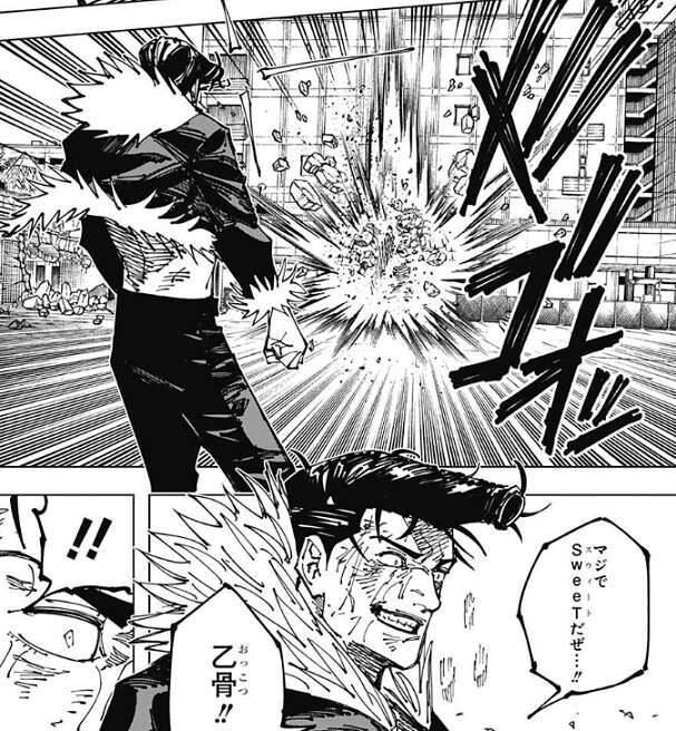 結局、石流の呪力の方が上回り乙骨は攻撃をくらってしまいます。一方石流は、マジでSweeTだぜ…!!乙骨!!と、乙骨を褒めますが、立ち上がる煙の中に乙骨の気配を感じ、石流は何回でもやろうと叫びます。