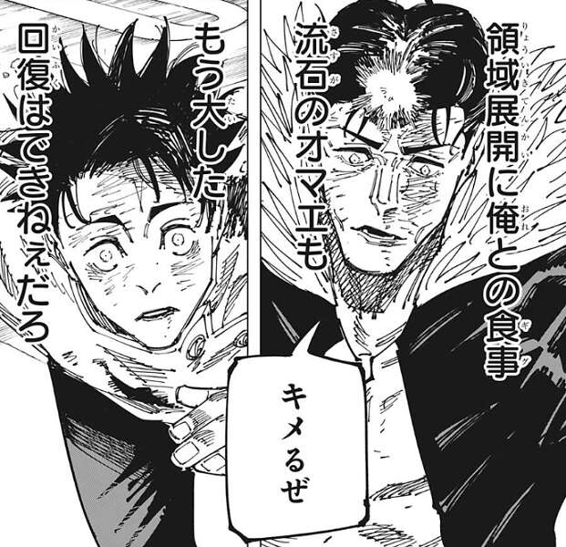 しかし、石流の400と余年の渇望、渇きに比例した熱い眼差しが乙骨の心を解かします。恐らく今後も戦いそのものに意味を見出すことはないと思われる乙骨ですが、あえて石流と同じタイミングで呪力を放出します。