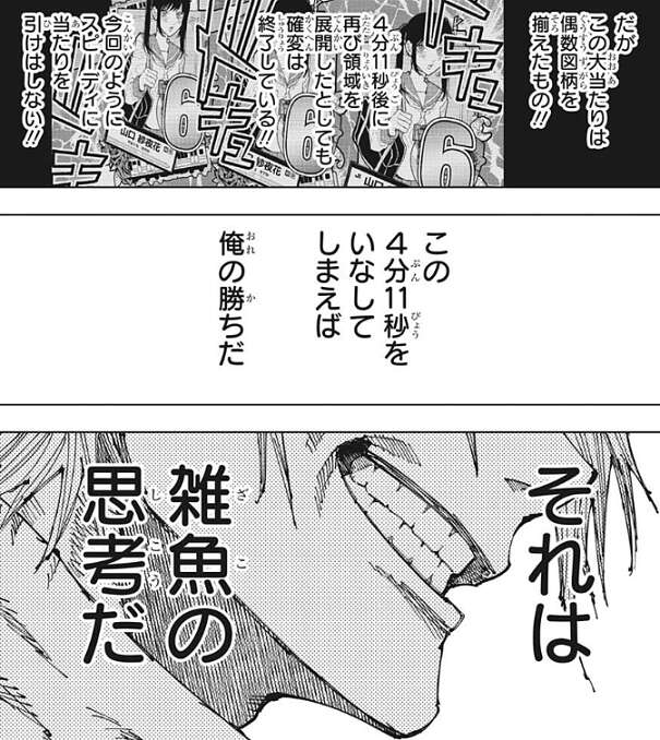 4分11秒の間に不死身のオマエを殺してみせる!!!と、鹿紫雲一は決意すると、呪力が溢れ続ける秤に挑みます。