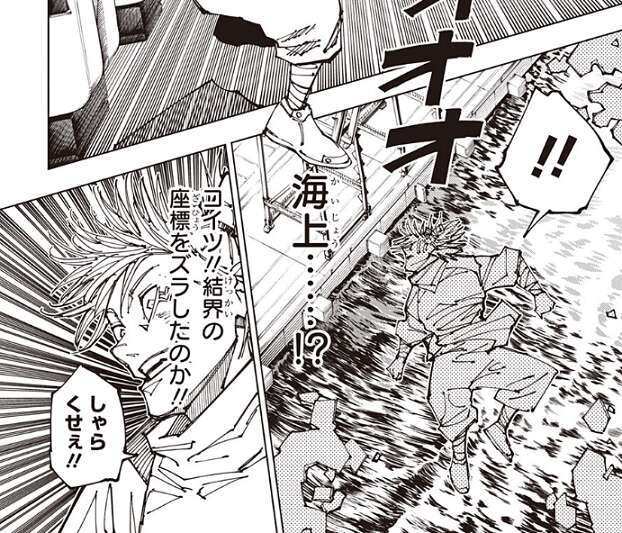 秤の蹴りを呪力なしで受けるわけにはいかなかった鹿紫雲一は、呪力を出したまま海中に落下してしまい、呪力が流れ続けてしまいます。鹿紫雲一は呪力を抑えようとしますが、海の上では秤が呪霊に捕まって鹿紫雲一を待ち構えています。秤は上がってこようとする鹿紫雲一を、呪力が空になるまで海中に落とし続けようと考えます。