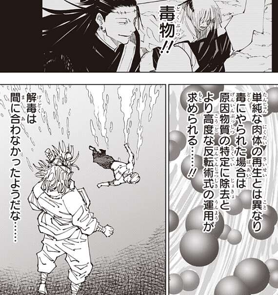秤の反転術式はフルオートですが、どうやら毒物の特定除去も無意識化で行えるようで、塩素ガスの特定除去を秤は無意識に行い、意識を回復したようです。秤は海水の温度が上がっている事に気付き、鹿紫雲一の電気の呪力のせいだと断定します。秤の顔の皮膚にも影響が出始めていて、このまま海中にいてラウンドが終われば、感電と熱湯の影響で再び秤が領域を展開できるか際どいと考えます。ラウンド終了まで残り5秒、海上に上がるべきか秤は一瞬考えます。