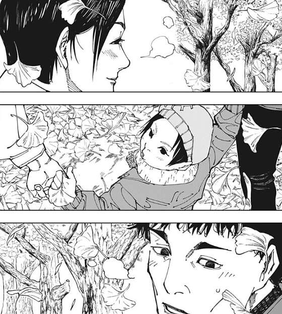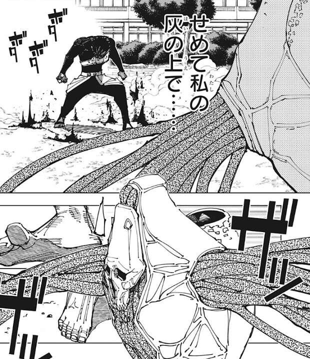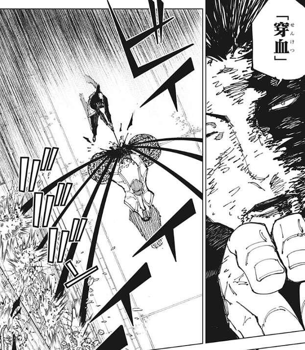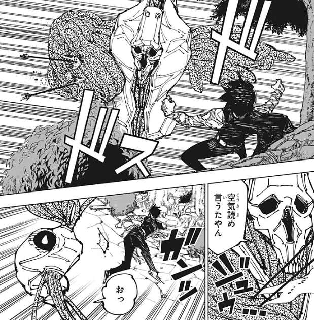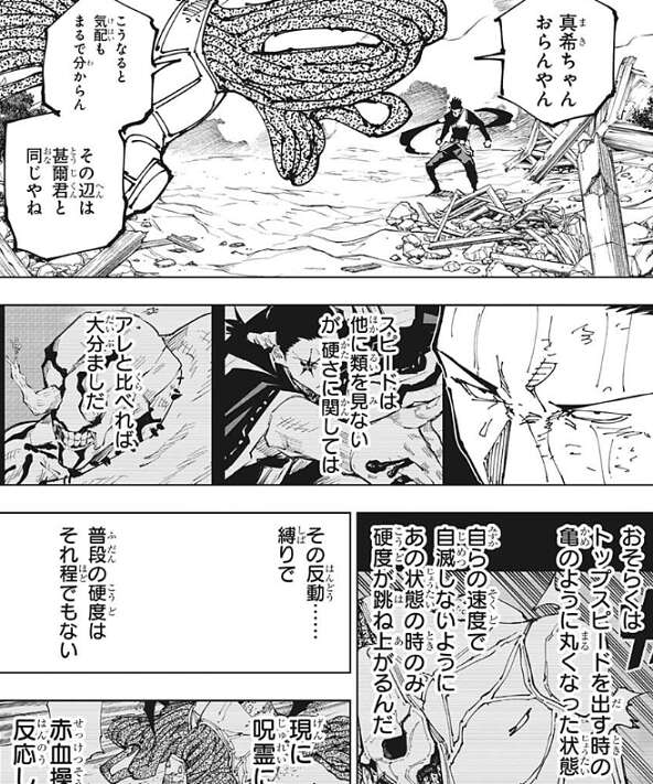 直哉は加茂憲紀を攻撃しようとしますが、赤血躁術で操った血で攻撃を防がれます。真希は傷を癒すため場所を移動していて、直哉は真希がいないことに気付きます。こうなると気配もまるで分らん、その辺は甚爾君と同じやね、と直哉は真希の気配が分からないとつぶやきます。スピードは他に類を見ないが、固さに関しては花御よりは大分ましだと加茂憲紀は思い、トップスピードを出す時の亀のように丸くなった状態の時のみ、自滅しないように硬度が跳ね上がると分析します。そして、その反動・縛りで普段の硬度はそれ程でもなく、現に呪霊にとって有毒な赤血躁術者の血に直哉が反応している、と加茂憲紀は考えます。