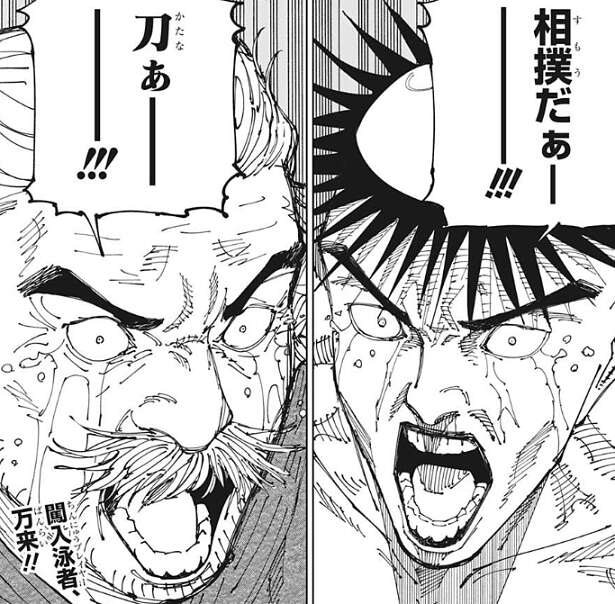 新たなプレイヤーの内の1人はカッパのような頭をしていて、相撲だぁーーー!!!と、叫んでいます。もう1人のプレイヤーは着物姿の老人で、刀ぁーーー!!!と、叫んでいます。突然、加茂憲紀と直哉の戦いに乱入してきた2人、一体何者でしょうか?