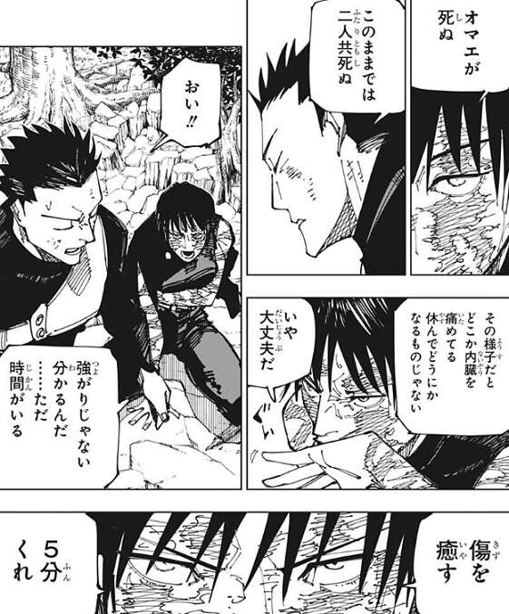 しかし、真希は結界の外に出ることを拒否し、少し休んで傷を癒す、5分くれ、と加茂憲紀に言います。勝算はあるのか?と、加茂憲紀に聞かれて、8:2と真希は答えます。真希の勝算が2割とのことですが、充分だ、と加茂憲紀は答えます。5分で死ぬんじゃねぇぞ、と真希は言いますが、約束できない、と加茂憲紀は答えます。加茂憲紀は次期当主でなくなったため、自分の生死はもう、さしたる問題ではない、と考えているようです。