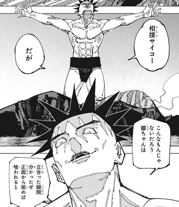 三代の領域は相撲を取るためにのみ機能する領域で、それ以外を全てそぎ落とした結界でした。三代は領域で拳をついて構え、真希に、相撲は好きかい?と、話しかけます。そして、再び真希を相撲に誘います。