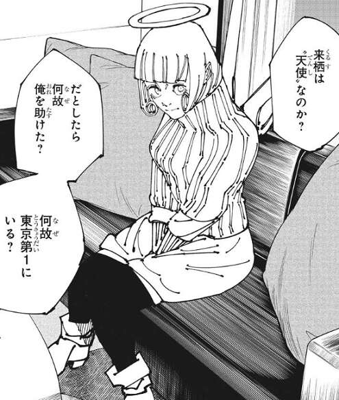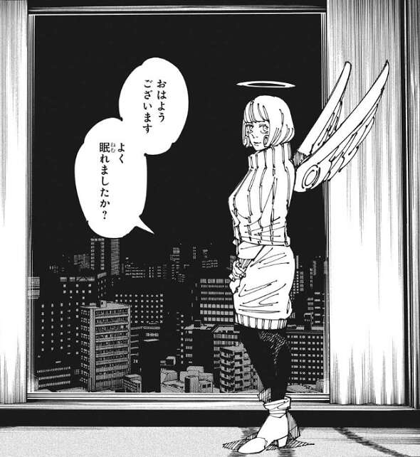 場面は東京第1結界(コロニー)へと移り、伏黒がホテルの一室で目を覚ますと、天使・来栖華が、おはようございます、よく眠れましたか?と、伏黒に声をかけます。そして、伏黒を「運命の人」と呼びます。