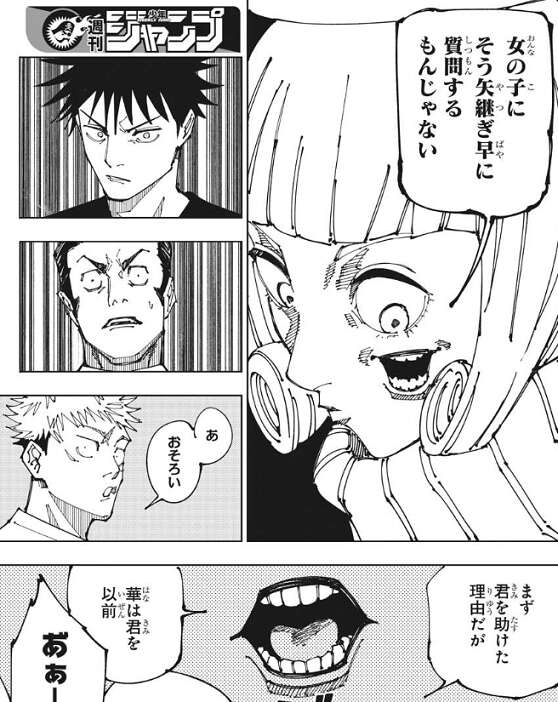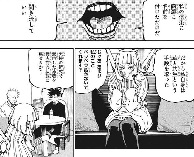 すると、来栖の体にもう一つの口が現れ、“天使”は私だと答えます。来栖の体に現れた口を見て、伏黒と髙羽は驚きますが、虎杖は宿儺で慣れているのか、おそろい、とつぶやくだけで驚きません。さらにもう一つの口は、女の子にそう矢継ぎ早に質問するもんじゃない、と言った後、伏黒を助けた理由を言おうとしますが、これは来栖によって遮られてしまいます。