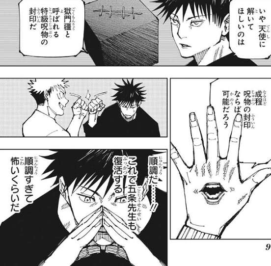 天使の術式で受肉したプレイヤーを受肉前の状態に戻せるか、と伏黒は聞きますが、受肉とは呪物と肉体の融合なので、都合よく片方だけ引き剥がすのは難しいらしく、受肉前の状態に戻すのは無理なのです。伏黒は獄門疆の封印を解いて欲しい、と天使に言うと、呪物の封印ならば可能だ、と天使は答えます。伏黒はこれで五条も復活する、と喜びますが、獄門疆の封印を解く前に先に協力してもらう、と天使は言ってきます。天使は“堕天”という受肉したプレイヤーをなんとしても屠りたいと言い、このプレイヤーを殺すことができれば協力は惜しまないことを約束する、と天使は断言します。