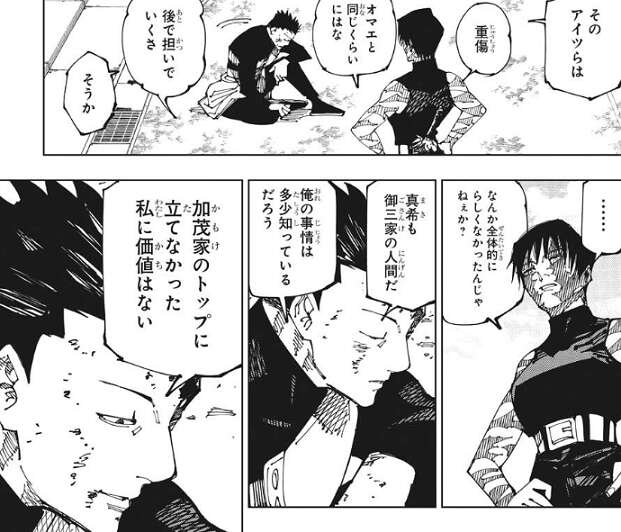 真希は直哉を倒した後、加茂憲紀と合流します。加茂憲紀は真希に、勝ったのか?と、質問すると、大道と三代のおかげだと答えます。大道と三代は重傷ですが、二人は真希が後で担いでいくそうです。真希は加茂憲紀に、なんか全体的にらしくなかったんじゃねぇか?と、聞きますが、加茂家のトップに立てなかったのを気にしているようで、加茂憲紀は私に価値はないと言います。