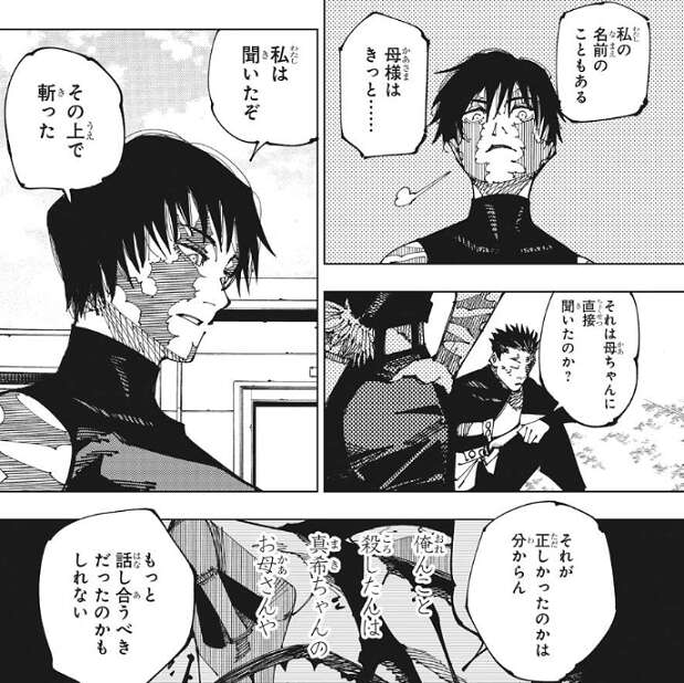 自分の名前のこともある、母様はきっと……、と言って加茂憲紀は落ち込んでしまいますが、自分は母親に直接聞いてその上で斬った、と真希は自分の事を話します。そして直哉が、俺を殺したのは真希のお母さんだ、と言っていたことを思い出しながら、もっと話し合うべきだったのかもしれない、と真希は加茂憲紀に言います。