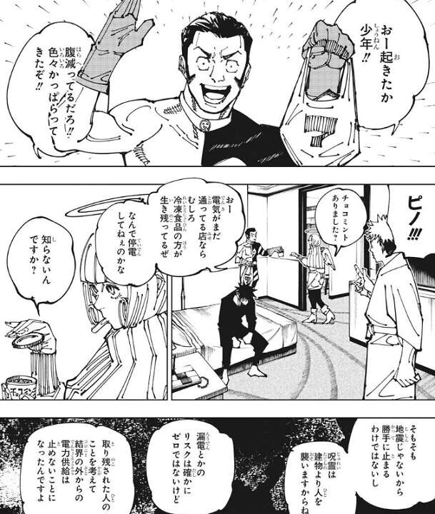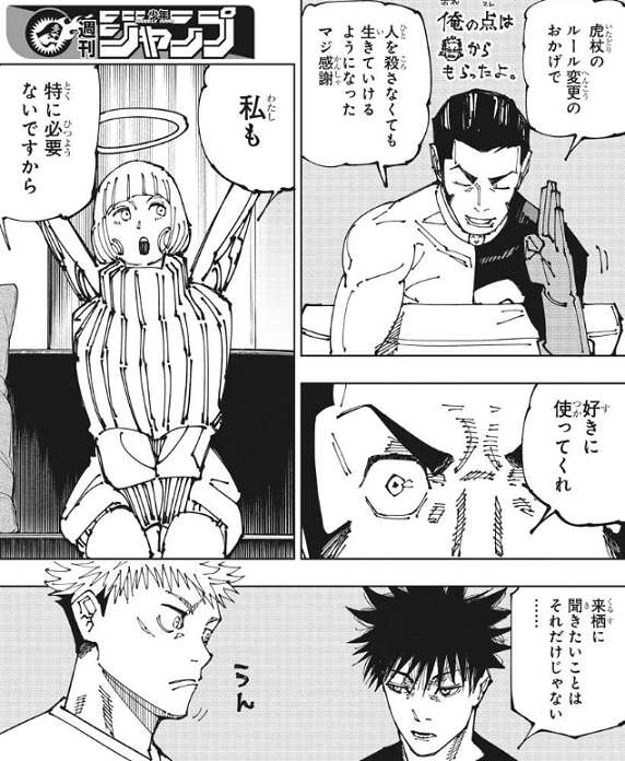 さらに虎杖は伏黒に、秤が100点を獲得した事、乙骨が190点を獲得した事、さらに伏黒、髙羽、来栖の点を合わせれば、合計359点を獲得したことを伝えます。ノルマを達成し、これで伏黒の姉・津美紀が助かると虎杖が言うと、伏黒も安堵します。後は、ルール追加後、何点で死滅回游から離脱できるかが重要、と伏黒は考えます。