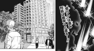 虎杖と来栖は万を追いかけようとしますが、ここで宿儺が、契闊、と唱えます。宿儺は2巻 第11話で虎杖と結んだ縛りを使います。宿儺が「契闊」と唱えたら、一分間体を明け渡す契約で、このタイミングで宿儺が虎杖の体に現れます。