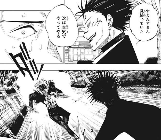 緊張する石流が答える前に、宿儺は斬撃を石流に飛ばします。宿儺は石流を三枚に卸すつもりだったようですが、石流は体に傷がついただけで斬撃をかわします。