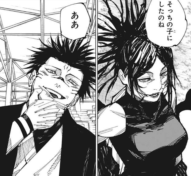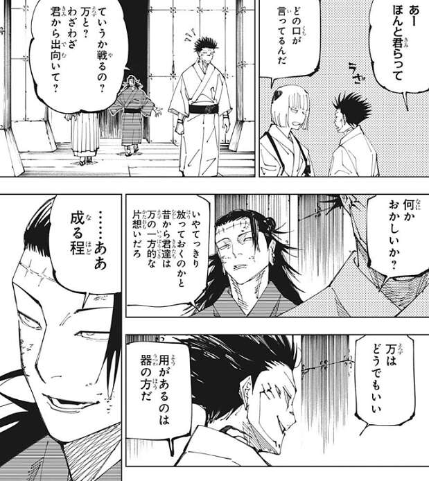 そして、宿儺は万と対峙します。万が、そっちの子にしたのね、と言うと、ああこっちの方が面が良かったものでな、と宿儺は返答します。