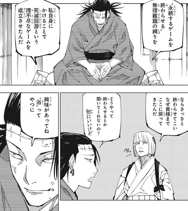 禪院家へと戻った宿儺や裏梅は、宿儺が行おうとしている浴の準備を始めます。裏梅が浴の準備をしている間、羂索は死滅回游を終わらせようとしている事を裏梅に話します。羂索の目的である「天元と人間の重複同化」は、死滅回游を終わらせないと実行できない、と羂索は裏梅に言います。そして、“永続するゲームを終わらせる”という無理難題の縛りを羂索自身にかけることで、死滅回游と言う理不尽なゲームを成立させていたようで、これをどうやって終わらせるかは、ここでは羂索は話しません。それより羂索は浴に興味があるようです。