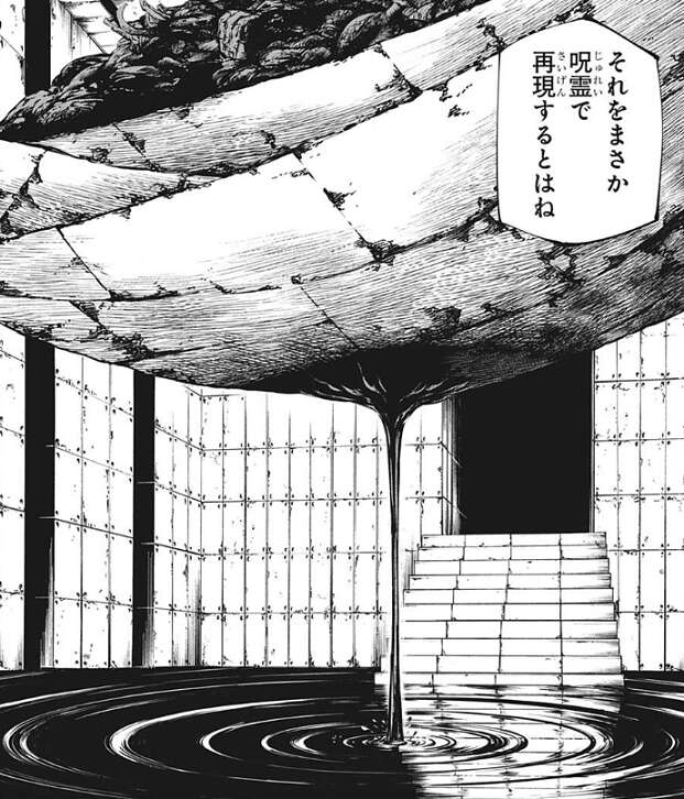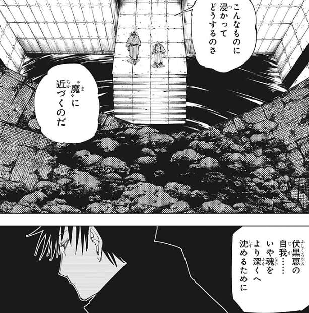 呪霊は殺すと消失反応で塵になってしまうので、裏梅は一体一体丁寧に締めていき、頭部など核に当たる部分のみを裏梅の術式で凍らせてから切り離し、残りを細切れにして濾していきます。こうして濾して出来た呪力の溶液のようなものに宿儺は浸かって、浴を行います。こうすることで宿儺は“魔”に近づき、伏黒の自我……、魂はより深くへと沈んでいくようです。