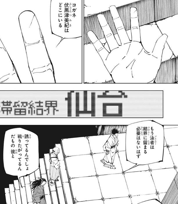 宿儺はコガネに津美紀がどこにいるか尋ねると、仙台結界(コロニー)にいることが分かります。万は会津の人間だったようで、羂索は、1000年ぶりに受肉したらまずは故郷を訪ねてみるのが人の常だろう、後は近場の結界(コロニー)へって……、と万の気持ちを代弁します。