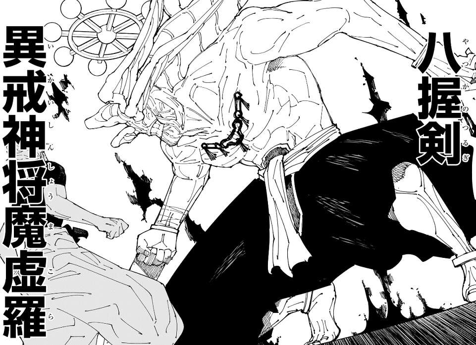 しかし、五条が宿儺に攻撃を加えるより前に法陣が回り、宿儺は布瑠部由良由良(ふるべゆらゆら)と唱えて、八握剣異戒神将魔虚羅(やつかのつるぎいかいしんしょうまこら)を召喚します。