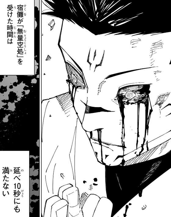 前回、宿儺が「無量空処」を受けた時間は延べ10秒にも満たなかったのですが、五条悟と同様に領域を展開することが不可能になるほどのダメージを脳に受けていました。宿儺は目と鼻から血を流しますが、これだけのダメージは予想していなかったのか驚きの表情を浮かべます。