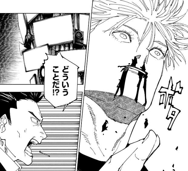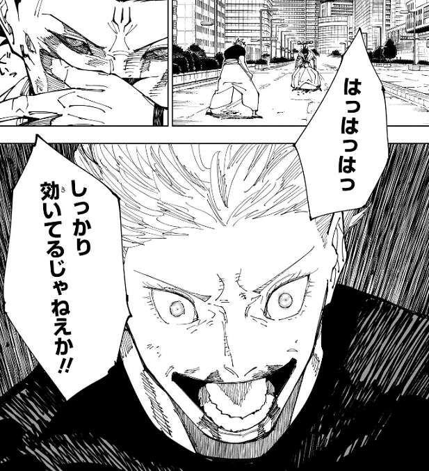 宿儺も領域を展開できないほどのダメージを脳に受けていると分かり、五条は笑いながら、しっかり効いているじゃねえか!!と、宿儺に叫びます。五条は、生徒が見てるんでね、まだまだカッコつけさせてもらうよ、と冥冥が操っていると思われる烏がいる方向を指さしながら、宿儺に言います。