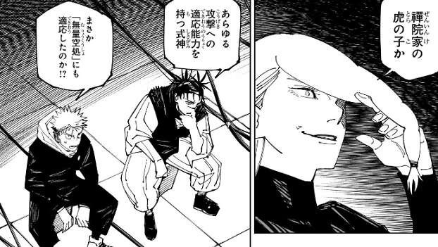 魔虚羅が出現したのを高専メンバー全員がモニターで見ていて、禪院家の虎の子か、と冥冥がつぶやきます。また虎杖は魔虚羅が無量空処に適応した事に驚いています。