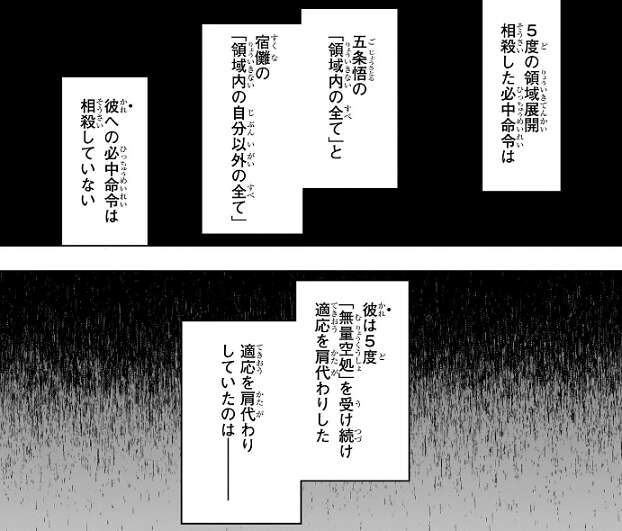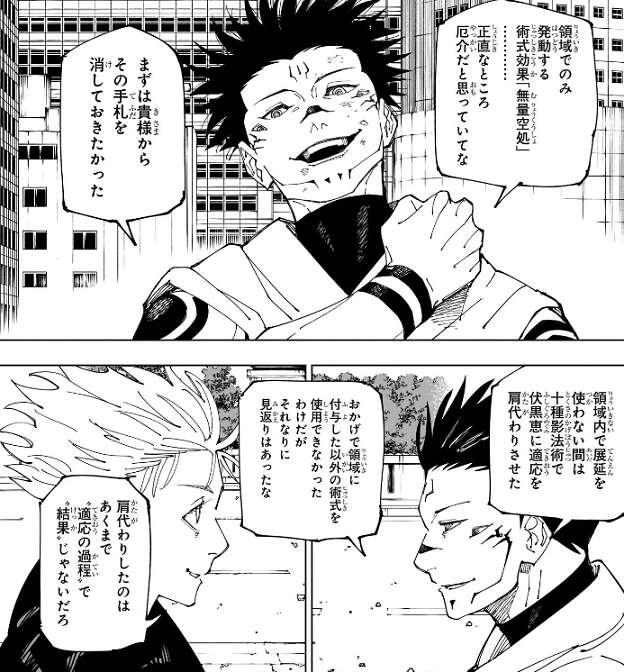 魔虚羅を影に戻しながら、何か言いたいことがありそうな顔だな、と宿儺は五条に言います。しかし、思ったより必死こいてくれてるみたいで嬉しいよ、と五条は煽り返します。宿儺にも「無量空処」は厄介だったようで、五条から「無量空処」の手札を消す為に領域内で展延を使わない間、十種影法術で伏黒に適応を肩代わりさせていました。このために宿儺は領域に付与した以外の術式を使用出来なかったとの事です。しかし、肩代わりしたのは“適応の過程”で“結果”ではなく、宿儺や伏黒の魂自体が「無量空処」に適応できた訳で無いので、五条が領域を展開すれば宿儺は魔虚羅をまた出さざるをえません。