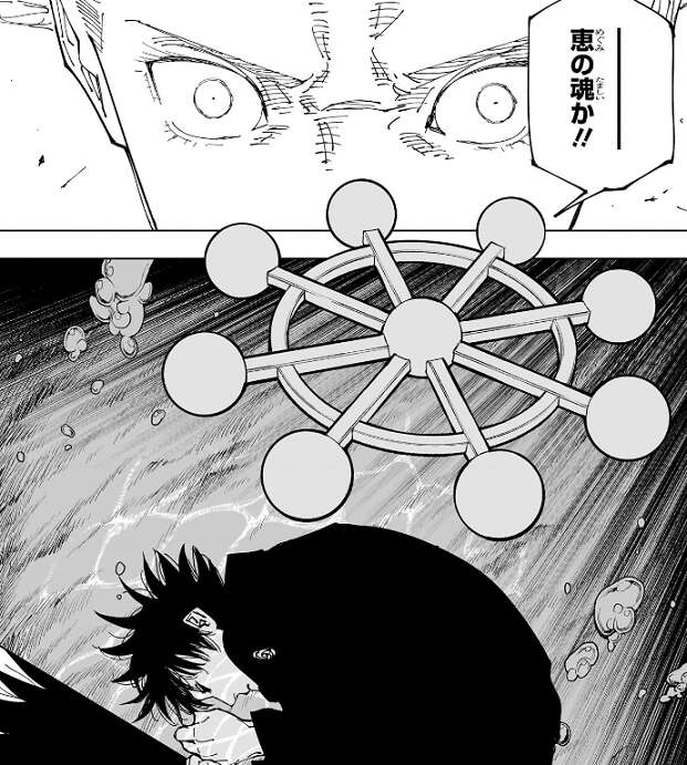 五条が、恵の魂か!!と、叫びます。眠っている伏黒恵の魂の後ろに法陣が描かれていて、適応を肩代わりしていたのは、伏黒だと判明します。