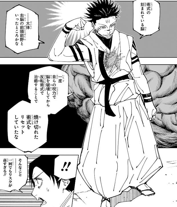前も五条は鼻血を出していましたが、やはり反転術式による焼き切れた生得術式の修復でかなりの無理をしていたようです。一度自らの呪力で脳を破壊してから反転術式で治癒する事で、五条は焼き切れた術式をリセットしていたようです。宿儺の言葉を聞いた乙骨は、一回でもリスクが高すぎる!!と、驚きます。