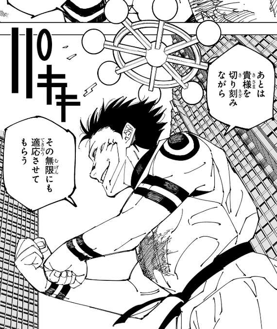 宿儺は次に出す領域を結界で閉じて五条の逃げ道をなくすと言うと、「無量空処」が出せないと分かっているので今度は自分の後ろに法陣を出します。そして、五条を斬り刻みながら無限に適応させてもらう、と宿儺は言います。