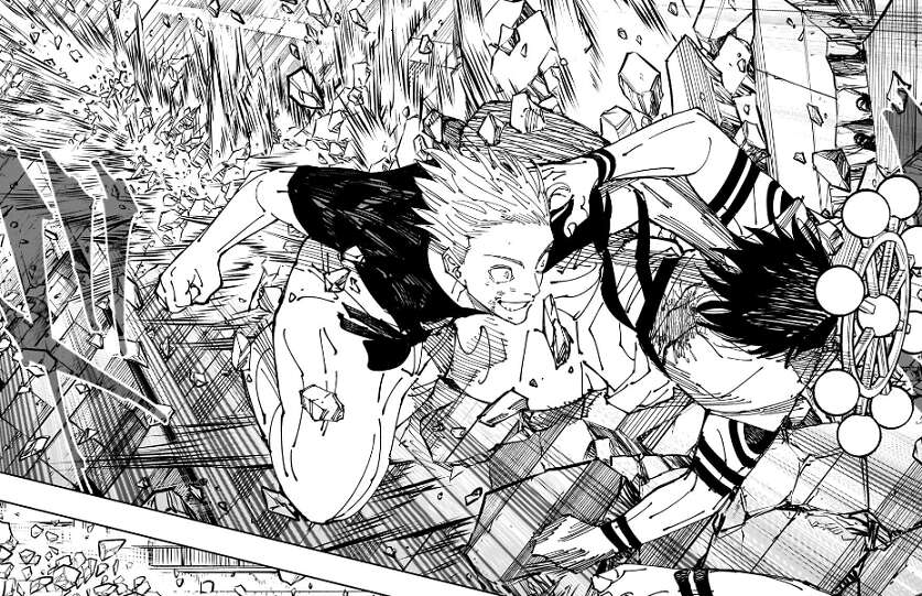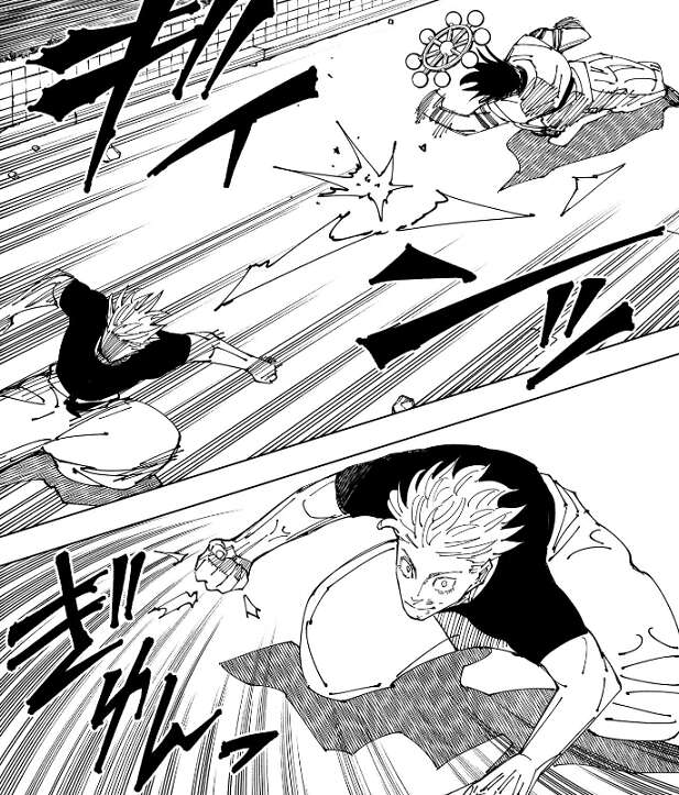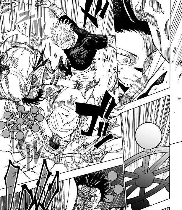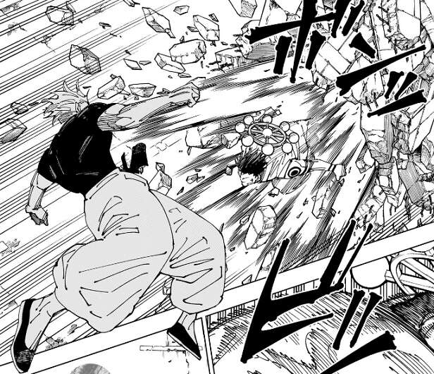 場面は五条と宿儺の戦いに戻りますが、五条は宿儺の頭を掴み壁に押し付けたり、投げ飛ばしたりしています。これもおそらく、無下限呪術を応用して攻撃してるのでしょうが、日下部の言う通り無下限呪術をどう使って攻撃しているのかよく分からず、凡人の想像を超えた戦闘が続きます。