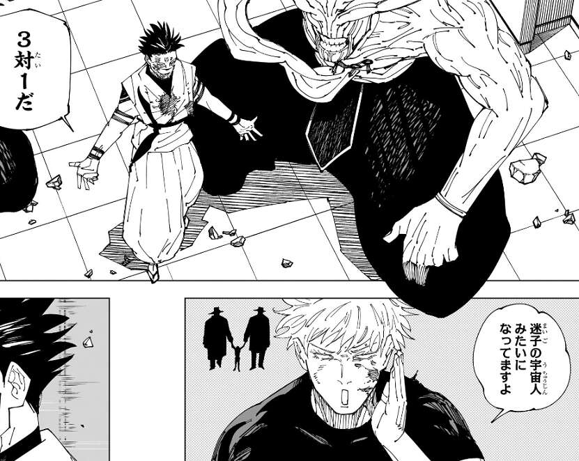 宿儺は魔虚羅と顎吐の三人で五条と戦うことにし、3対1の形になります。五条はこの状況でも、迷子の宇宙人みたいになってますよ、と宿儺を馬鹿にしてさらに煽ります。