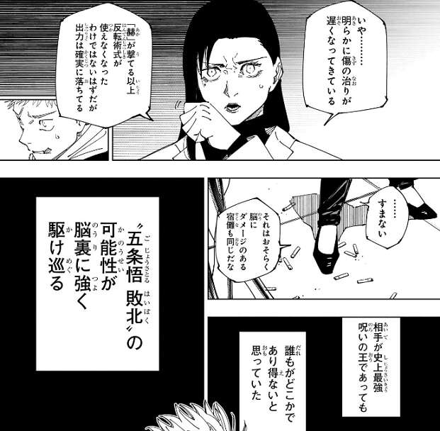 しかし家入硝子は、明らかに傷の治りが遅くなってきている、「赫」が撃てる以上反転術式が使えなくなったわけではないはずだが、出力は確実に落ちている、と言い、それを聞いた虎杖は五条の心配をして不安そうな顔をします。虎杖の不安そうな顔を見て、宿儺も脳にダメージがあるので出力が落ちているのは宿儺も同じ、と家入硝子は言葉を付け足します。