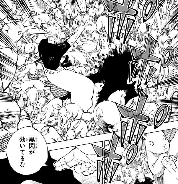 すると、宿儺は式神・脱兎を使って五条の術式反転「赫」が魔虚羅に直撃しないように、隙を作ります。前回、宿儺は五条の黒閃をくらって意識を失ったように見えましたが、意識はまだギリギリあったのか、普通に式神を使ってきます。しかし、黒閃は効いているようで宿儺は休んで、五条と同様に傷を治していたようです。