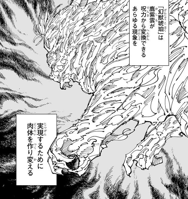 術式「幻獣琥珀」は鹿紫雲一が呪力(でんき)から変換できるあらゆる現象を、実現するために肉体を作り変えるそうで、鹿紫雲一の口の部分には呪力で変形させた何かが装着されています。