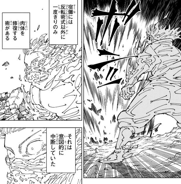 電撃も使って宿儺にダメージを負わせ、宿儺はかなりのダメージを負ってしまいます。それに対して、宿儺には反転術式以外に一度きりのみの肉体の修復する術があるようですが、宿儺はそれを意図的に中断していました。