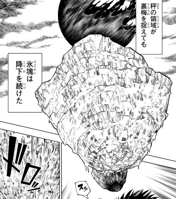 秤の領域展開「坐殺博徒」は裏梅を捉えたようですが、強大な氷塊は止まらず降下を続けます。そして、氷塊の中から呪具が現れます。