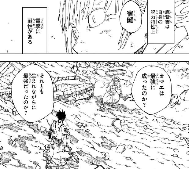 しかし、鹿紫雲一は呪力特性上、電撃に耐性があるので神武解が効かなかったようです。そして鹿紫雲一は宿儺に、最強になったのか、それとも生まれながらに最強だったのか、と質問します。