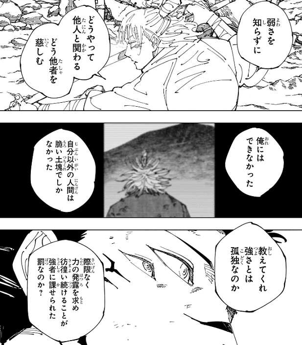 鹿紫雲一は宿儺に、強さとは孤独なのか?際限なく力の発露を求め、彷徨い続けることが強者に科せられた罰なのか?と、問いかけます。セリフの内容からどうやら、鹿紫雲一は受肉する前から、自分以外の人間とのかかわり方に悩んでいたようです。