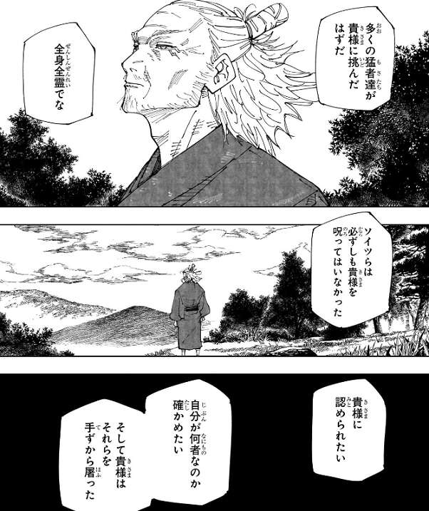 これで鹿紫雲一は解をくらいやられてしまったようですが、死んだかどうかまでは不明です。しかし五条の時と同様、死んだ後の世界で受肉する前の老いた姿に戻っているので、鹿紫雲一は死んだ可能性が高いと思われます。そこで、鹿紫雲一は宿儺と話をしています。宿儺は鹿紫雲一に、多くの猛者達が挑んだはずだが、そいつらは必ずしも鹿紫雲一を呪ってはいなかった、と言います。そして、鹿紫雲一に認められたい、自分が何者なのか確かめたい、そして貴様はそれらを手ずから屠った、これが慈愛でなくて何だというのだ、と宿儺は鹿紫雲一に言います。