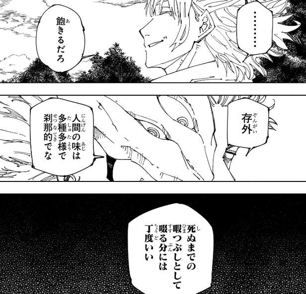 宿儺は他者に満たしてもらおうなどと考えた事は一度も無いようですが、鹿紫雲一はそれを聞いて飽きるだろう?と、つぶやきます。しかし宿儺にとって人間の味は多種多様で刹那的で、死ぬまでの暇つぶしとしてすする分には丁度いい、と宿儺は鹿紫雲一に答えます。ここで死んだ後の世界の描写は終わり、場面は元に戻ります。