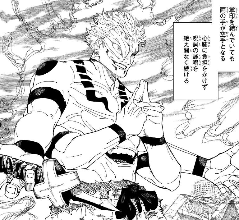 4本の腕があるため掌印を結んでいても、両の手が空手となり呪具の使用や戦闘が可能となります。また2つの口があるため、心肺に負担をかけず呪詞の詠唱を絶え間なく続けることが出来るようです。腕と口が倍あるので呪術師としてこれ以上ない優位性となり、さらに異形の肉体ですが宿儺は一切の身体機能を損なっていないようです。