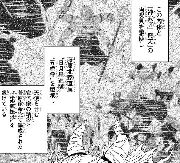 平安時代に宿儺はこの肉体と「神武解」「飛天」の両呪具を駆使して、藤原北家直属の“日月星進隊”“五虚将”を殲滅し、天使を含む安倍家や菅原家の精鋭を退けたそうです。鹿紫雲一は宿儺の姿を見て、なんて美しいんだ!!と、心の中でつぶやきます。