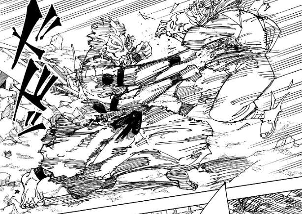 次は日車と虎杖のタッグが参戦です。一緒に出てきたので二人でタッグを組んで闘うのでしょうが、どのように戦うのかは不明です。おそらく日車の領域展開「誅伏賜死」で宿儺を攻略しようと考えている可能性が、今のところ高いのかな?と考えています。ただ、今の宿儺に「誅伏賜死」が通用するかというと、ちょっと難しいような気がしますが…。そして、虎杖の腕と爪がおかしくなっている気が…、気のせいでしょうか?