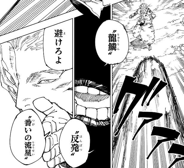 大声を出し鹿紫雲一は口から衝撃波を出しますが、宿儺は避けようともせず、“龍鱗”“反発”“番いの流星”と呪詞を唱えると斬撃を出します。しかもわざわざ鹿紫雲一に、避けろよ、と助言する余裕まで宿儺は見せます。