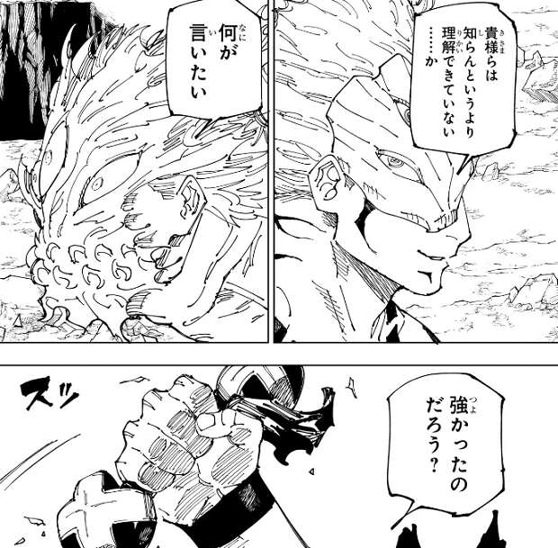 そして、五条や鹿紫雲一は愛を知らないというより、理解できていない、と宿儺は言います。鹿紫雲一は、何が言いたい、と言うと、強かったのだろう?と、宿儺は鹿紫雲一に問いかけます。