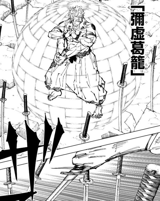 この乙骨の領域展開に対して、宿儺は彌虚葛籠(いやこつづら)で対抗します。彌虚葛籠はレジィが第171話で使用した奥義で、シン・陰流「簡易領域」の原型であり、領域を中和し必中効果を打ち消す性能を持つ奥義です。宿儺は彌虚葛籠で乙骨の領域に付与された必中効果を打ち消し、防御していました。