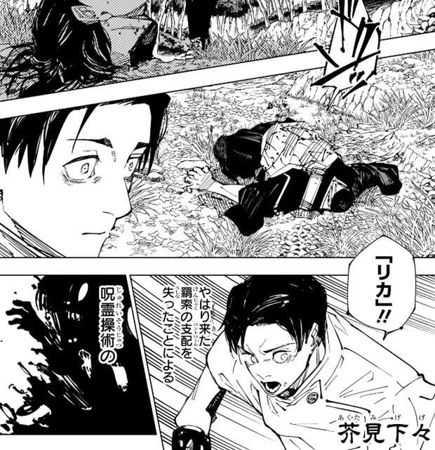 場面は新宿に戻り、乙骨は宿儺の傷が治っているのを見て、宿儺の反転術式の出力が戻り始めている事に気付きます。このままでは宿儺が再び、領域を使えるようになるのも時間の問題かもしれない、と乙骨は予想し、日車がやられた事も自分のせいだ、と自分で自分を責めます。岩手県御所湖結界(コロニー)には行かず、「処刑人の剣」のプランを全力でサポートするべきだったのでは?羂索の奇襲は真希でもよかったんじゃないのか?など、乙骨の頭に色々な考えが浮かんできます。しかしそんな考えをすぐに否定し、呪霊操術の暴走は渋谷での呪霊放出を最大規模として、それを人的被害なく食い止めるにはリカちゃんの力が不可欠だった、と乙骨は自分に言い聞かせます。