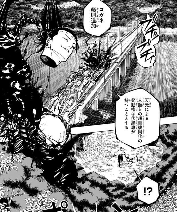 羂索の頭を呪霊が持ち、羂索は首だけの状態でコガネにルール追加を要求します。天元による人類との超重複同化の発動権は伏黒恵が持つこととする、というルールですが、このルール追加はコガネによって承認され、<総則(ルール)>15として追加されます。また、よく見ると乙骨は片手で白装束姿の髙羽を掴んで、持ってきています。
